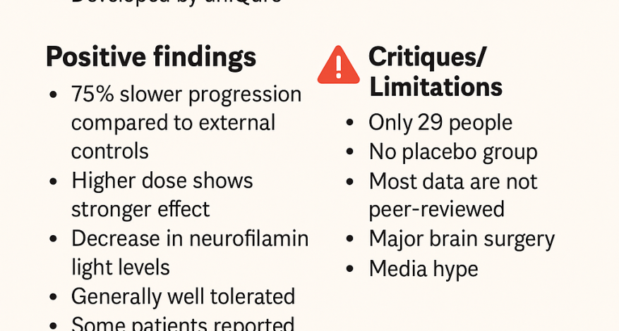 AMT-130 is a milestone — the first time a gene therapy has shown signals of slowing Huntington’s disease. It brings hope but must be understood with caution: