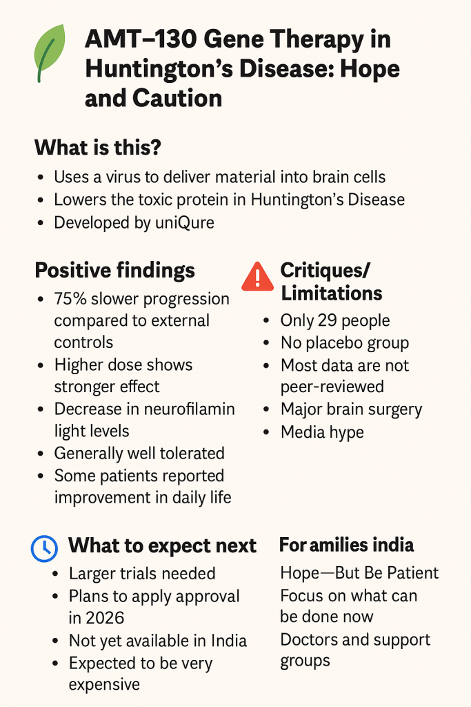 Introduction Huntington’s disease (HD) is a rare, inherited brain disorder that affects thousands of families worldwide, including in India. It causes problems with movement, memory, and daily function, and currently has no cure. In late 2025, news outlets and scientific groups around the world reported that a new experimental treatment — AMT-130 gene therapy —…